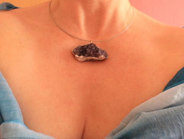 Ametyst je zavěšen na obruči z nylonového lanka - nestudí tak a nemáte na tělě chladnou kovou obruč. Obruč hezky drží kulatá tvar.