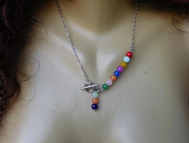 Jednoduchý jemný nerezový řetízek s barevnými kuličkami jadeitu.