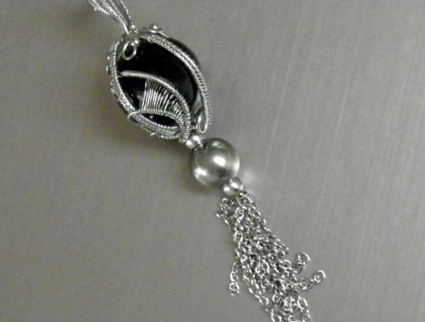 Náhrdelník s velkou kuličkou onyxu. Přívěsek je vytvořený technikou wire wrapping z drátků z nerezové oceli, doplněný korálky z nerezu a nerezovými řetízky. Je zavěšený na nerezovém kuličkovém řetízku, dlouhém 60 cm. Vhodné pro alergiky.