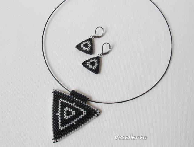 Moderní šperk geometrických tvarů v klasické černo-bílé kombinaci s odstíny šedé.