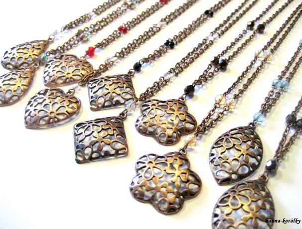 Náhrdelník - řetízek 60cm s filigránovým řezaným přívěskem - kapka 4 x 2,5 cm v hnědé - měděné barvě - doplněný broušenými korálky - bílé čiré s ab efektem - duhové