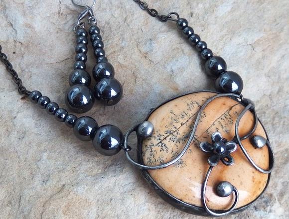 Souprava - cínovaný náhrdelník z obrázkového jaspisu a hematitových korálků + naušnice