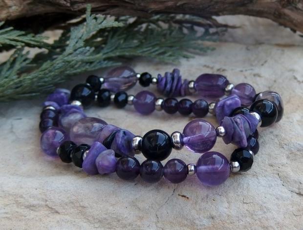 Z korálků ametystu, černého obsidiánu a zlomků čaroitu.