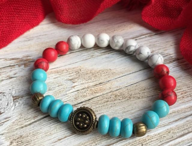 Náramek z korálků červeného, bílého a tyrkysového tyrkenitu - howlitu (8 mm), rondelek a mosazných korálků. Náramek je pružný - cca 18 cm