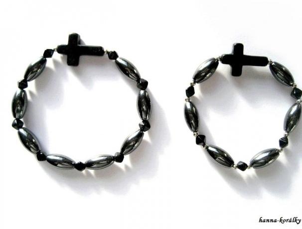 Náramek z magnetických hematitových olivek, doplněné černými korálky a křížem z černeho tyrkysu, navlečený na silikonové gumičce, takže se krásně přizpůsobí a lehce se natáhne na ruku - délka 22-23cm, barva - antracitová, černá