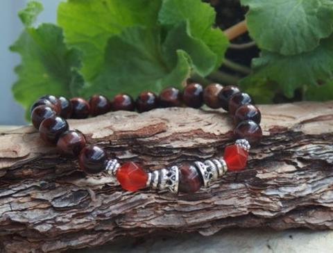 Harmonizační náramek pro mysl, tělo i duši. Z býčího oka, karneolu a korálků z obecného kovu.
