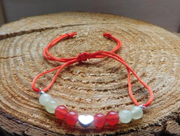 Jednoduchý, ale výrazný náramek ze saténové stužky a žlutého a červeného jadeitu a nerezového srdíčka..