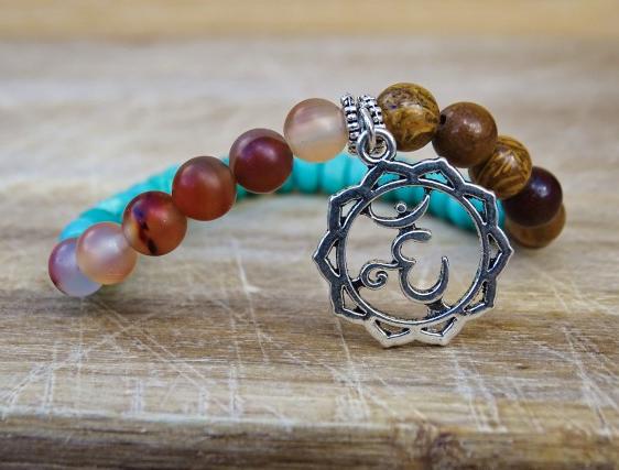 Tento náramek byl vytvořen z minerálů a je zdobený stříbrným přívěskem s posvátným znakem ÓM.