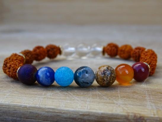 Tento čakrový náramek byl vytvořen nejen z kamenů, ale také z posvátných plodů Rudraksha, pocházejících ze stromu Elaeocarpus ganitrus z Himalájí.