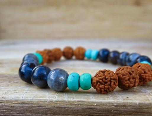 Tento náramek byl vytvořen nejen z kamenů, ale také z posvátných plodů Rudraksha, které pochází ze stromu Elaeocarpus ganitrus z Himalájí.