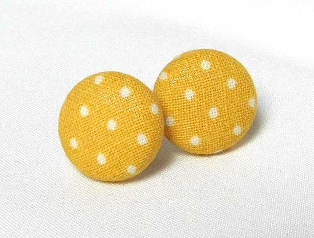 Náušnice (puzetky) tvořené technikou potahování knoflíků. Vytvořeny jsou z kovových komponentů a žluto(okrovo)bílé bavlněné látky. Průměr náušnice je 1,5 cm. Součástí jsou kovové špuntíky proti vysmeknutí z ucha.