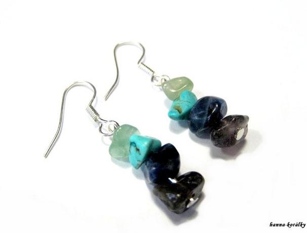 Náušnice z přírodních kamenů - polodrahokamů, použité minerály se vztahují k 4.-7. čakře a jsou poskládány tak, aby spolu harmonizovaly, délka - 3,5cm vč.naušnicového háčku.
