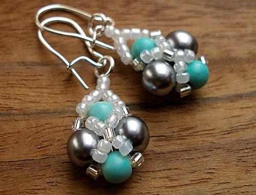 Efektní, drobné šité náušničky z korálků minerálního kamene tyrkenitu, světle modrého a šedého rokajlu a vosk. perliček.