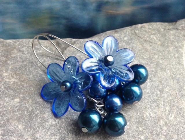 Visací cinkáčkové náušnice - voskované kuličky modré barvy a modrá plastová kytička. Delší uzavíratelný háček a komponenty v barvě platiny - běžný kov. Celková délka 6 cm
