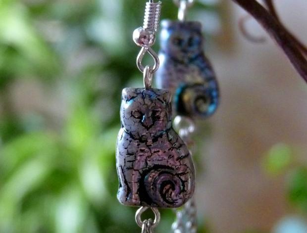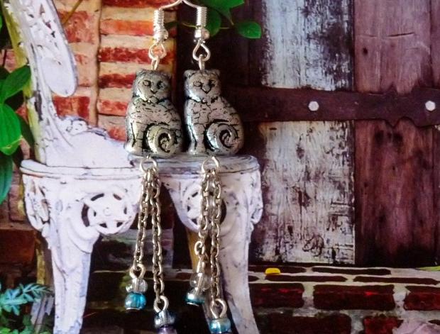 Půvabné stříbřitě šedé kočky s duhovou patinou jsou vyrobeny v Jablonci a jsou doplněny delšími jemnými řetízky s průhledným rokajlem s odlesky do modra a fialova.