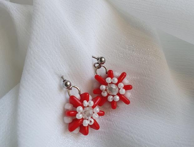 Naušnice zhotovené technikou beadweving - šití korálků. Použita je profesionální "nepřetrhnutelná" Nymo nit, Czech Mates Triangles, Precioza rocail, Toho, ohňovky. Jsou lehoučké a elegantní.