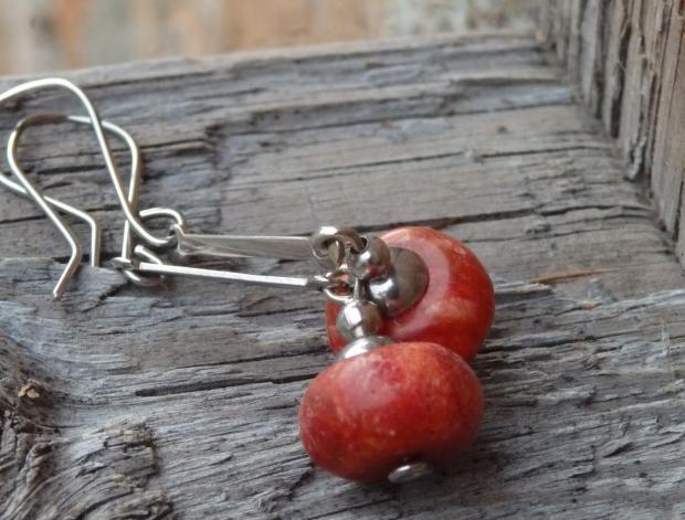 Jemné náušnice s korálovým diskem a kovovými korálky a komponenty stříbrné barvy.