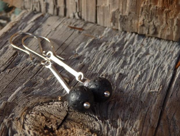 Jemné náušnice s lávovou kuličkou a kovovými korálky a komponenty stříbrné barvy.