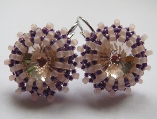 Základem náušnic jsou kamínky swarovski - rivoli přilepené dvousložkovým lepidlem k náušnicové základně. Celou náušnici jsem obšila kvalitními korálky TOHO.