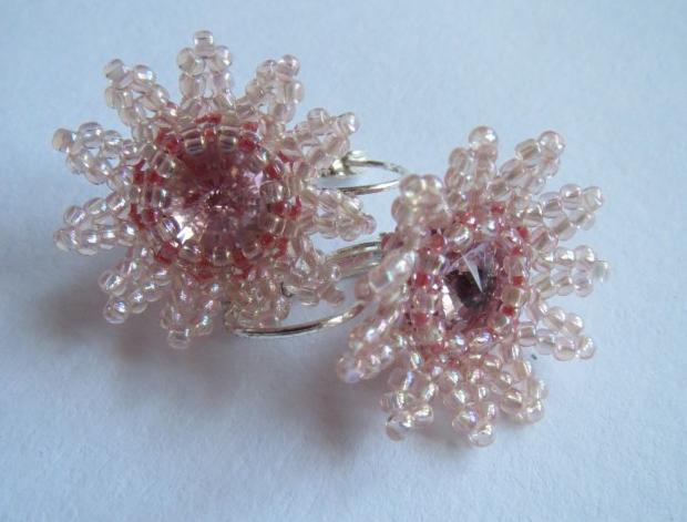 Základem náušnic jsou kamínky swarovski - rivoli přilepené dvousložkovým lepidlem k náušnicové základně. Celou náušnici jsem obšila korálky TOHO, aby vytvořily květinku.