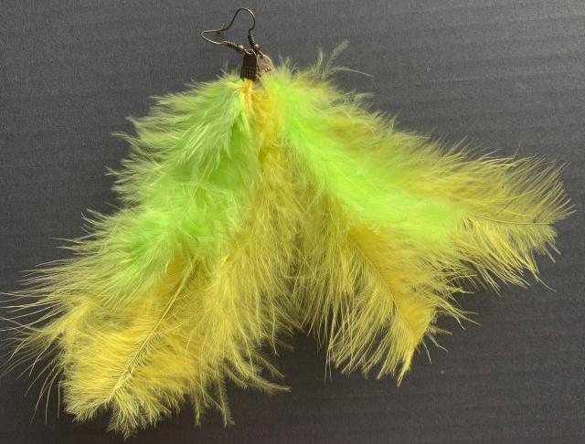 Dlouhé výrazné "boho" náušnice se žlutými a zelenými peříčky. Délka od háčku 14 cm. Háček a komponenty v barvě mosazi - běžný kov, gumové zarážky.