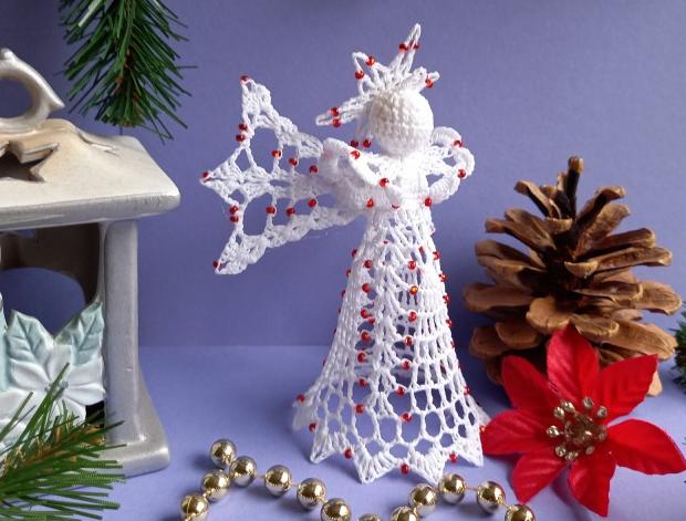 Háčkovaný andílek ze slabé, bílé, 100% bavlněné příze, bohatě zdobený vháčkovanými temně rudými korálky.