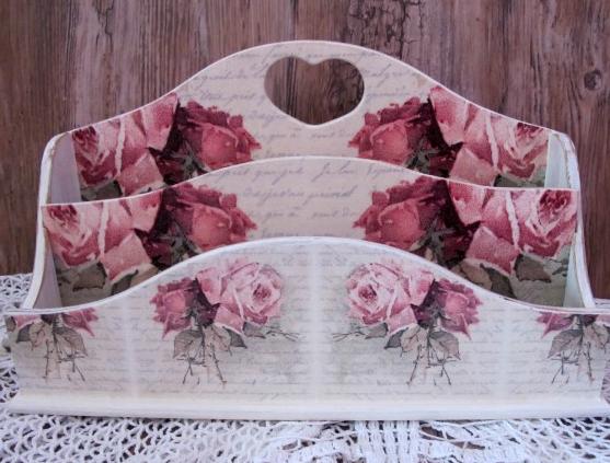 dřevěný stojan nebo pořadač na dokumenty,vzkazy,dopisy a jiné poznámky,je lazurován,natírán,po té zdoben technikou decoupage písmem a krásnými růžemi,nakonec pro snadnou údržbu a možnost otírat vlhkým hadříkem od prachu je lakován velmi kvalitním lakem atestovaným pro úpravu dětských hraček