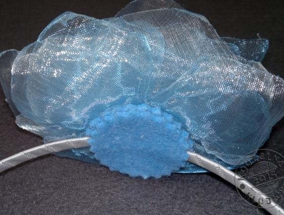 Čelenka univerzální velikosti, kovový základ potažený atlasovou stužkou světle šedé barvy. Bohatý květ poskládaný z organzy světle modré barvy, (průměr květu cca 10 cm, výška cca 4 cm), zdobený korálkem, začištěný filcem.