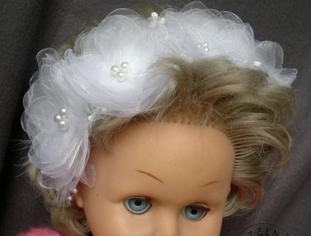 Čelenka univerzální velikosti, kovový základ potažený atlasem/saténem bílé barvy, zdobená 4 květy, které jsem vyrobila z bílé organzy (průměr cca od 8 - 9 cm do 5 cm), perličkami, peříčky, tylem, pestíky a perličkami na vlasci, květy začištěny filcem. Čelenku můžete použít tak, že velký květ máte na pravé straně hlavy jako na fotografii, ale můžete ji otočit a mít velký květ na levé straně. Obě strany jsou stejné!!!