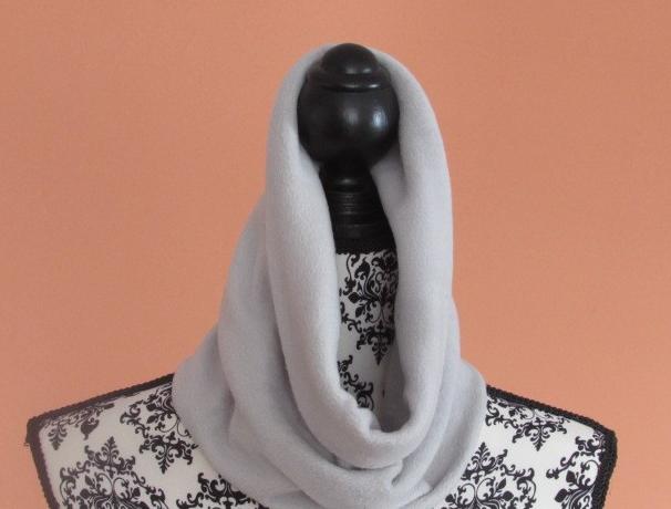 Hřejivý a pěkný oboustranný nákrčník. Světle šedý fleece.