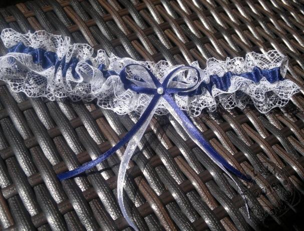 Jemný krajkový podvazek zdobený MODROU saténovou stuhou - 4 RŮZNÉ ODSTÍNY (světle/ledově modrá, tyrkys, sytě/královsky modrá,tmavě modrá), mašličkou ze stužek a perleťovým věnečkem (kolečkem).