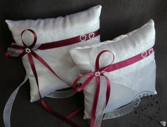 Satenový polštářek pod snubní prstýnky v bílé barvě, zdobený něžnou bílou krajkou, bílou šifonovou, barevnou atlasovou stužkou - odstín tmavě vínová/bordó nebo krvavá (vínovorůžová) a srdíčky, plněný dutým vláknem. Rozměry cca 15x15 cm. Na společné fotografii je vlevo tmavě vínová/bordó a vpravo krvavá/vínovorůžová. VYBERTE SI ODSTÍN STUHY A NAPIŠTE MI DO POZNÁMKY!