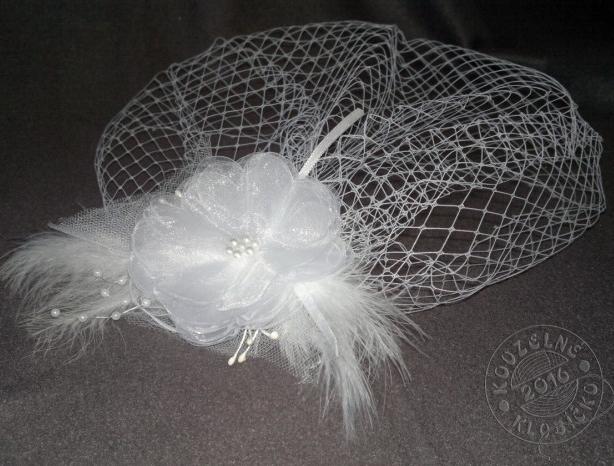Závoj z francouzské síťky, připevněný na plastovém hřebínku šíře 8 cm, zdobený květem z bílé organzy (průměr cca 8 cm), perličkami, peříčky, tylem, perličkami na vlasci, pestíky a stužkou - vše v bílé barvě.