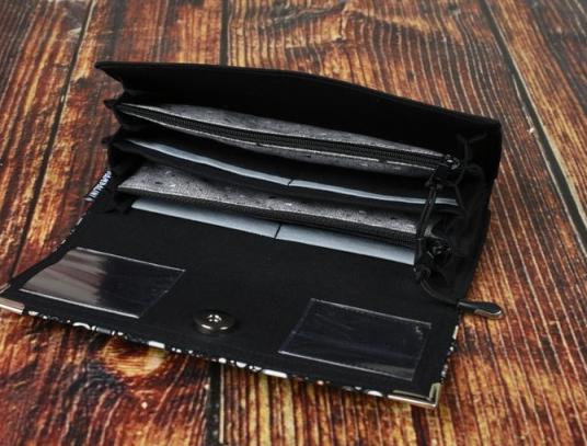 Velká peněženka ušitá z krásné zahraniční designové látky. Pevně vyztužená a opatřená kovovými rohy.