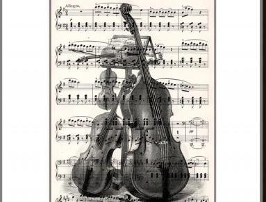 Obrázek hudebních nástrojů pocházející z 2.poloviny 19.století vytištěný archivačním inkoustem na starém notovém papíře z roku 1900 o rozměru 33 x 21,5 cm.