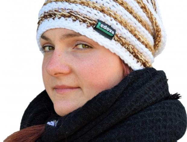 Háčkovaná dámská i dívčí čepice ve vodorovném žebrovém vzorečku z akrylových přízí