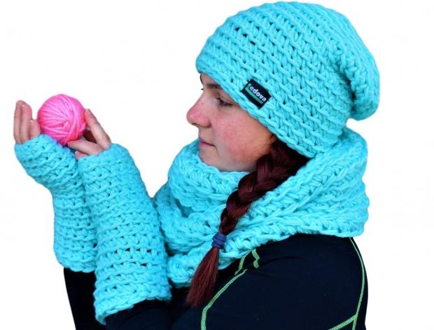 HÁČKOVANÁ SOUPRAVA ČEPICE, NÁKRČNÍKU A BEZPRSTOVÝCH RUKAVIČEK ZE SILNÉ ABSOLUTNĚ HEBOUČKÉ AKRYLOVÉ PŘÍZE