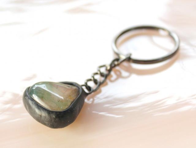 Přívěsek na klíče je zhotoven z tromlovaného kamínku a kovových kompenentů technikou tiffany (cínování, měkké pájení). Celá klíčenka je dlouhá 7cm. Přívěsek je patinován a ošetřen antioxidantem.