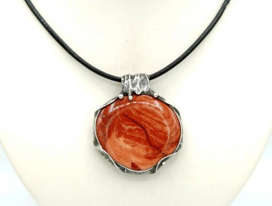 Masivní přívěsek - náhrdelník, s leštěným jaspisem kytičkovým, oboustranný, z bezolovnatého cínu, patinován, ošetřen proti oxidaci.