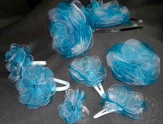 Základem je polotovar - prstýnek s lůžkem který je přizdoben organzovým kvítkem (průměr cca 4 cm) a perličkou - kombinace tyrkysové a bílé.