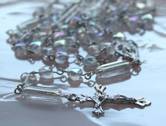Ketlovaný růženec z mačkaných skleněných korálků ve tvaru srdíček čiré barvy s AB leskem (perleťově duhový až kovový lesk), skleněných kvádříků čiré barvy a kovových komponentů má po obvodu délku 71cm. Přívěsek je dlouhý 11cm včetně křížku.