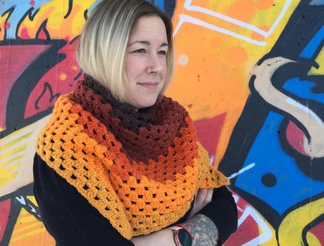 Háčkovaný šátek z měkoučké hrubší barevné vlny CAKE - 100 % akryl (hnědá, rezavá, oranžová, hořčicová)