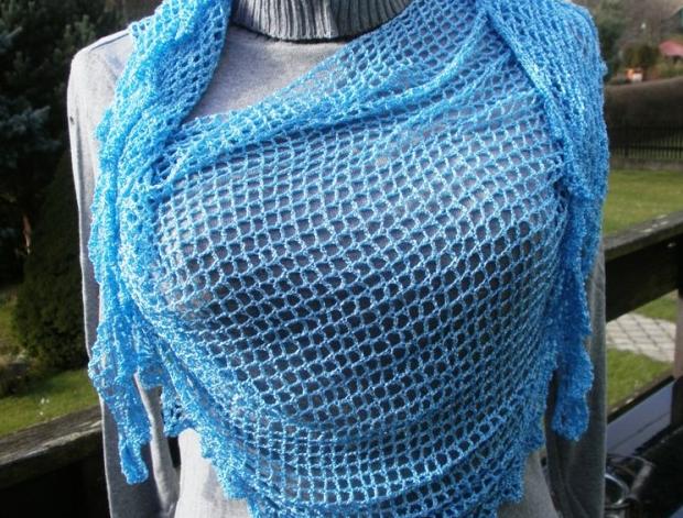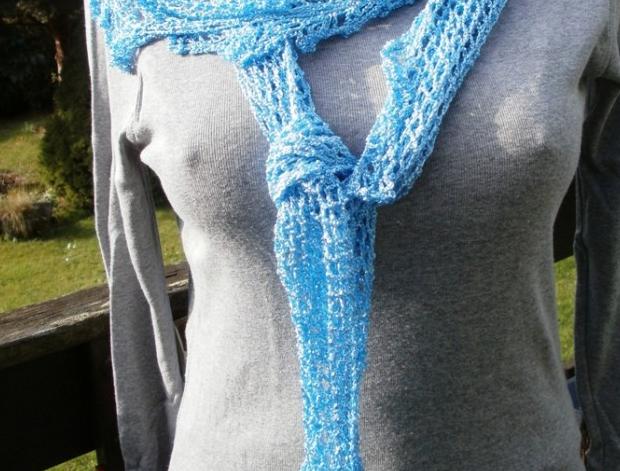 Háčkovaný šátek - lesklý ve světle modré barvě.