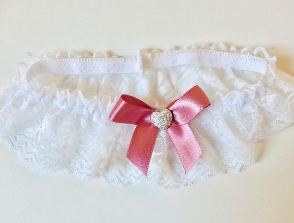 Bílý svatební podvazek, je vytvořen z krajky a je ozdoben stužkou a saténovou mašličkou se srdíčkem.