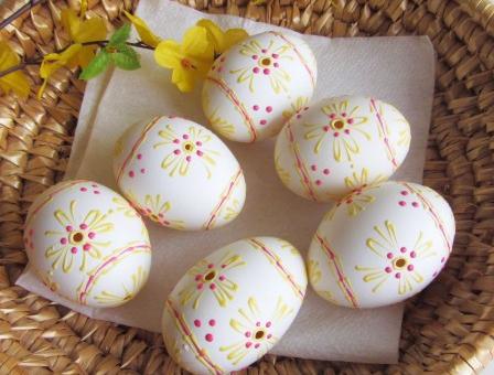 Kraslice zdobeny madeirovou technikou, zdobené žlutým a červeným voskem. Vajíčka jsou od slepic z domácího chovu v přírodních barvách. Výfuky jsou vysaveny, což zaručí jejich bělost a větší trvanlivost.