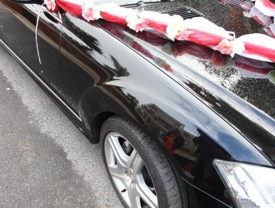 Svatební dekorace auta, šerpa z organzy, kterou zdobí umělé růže. Dekorace lze zhotovit v různých barvách.