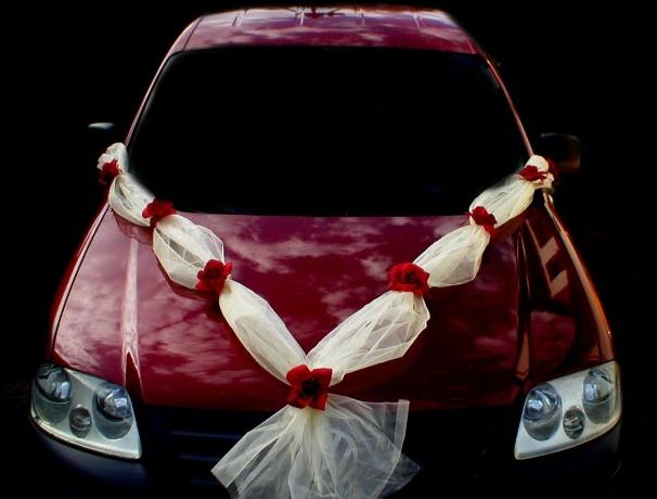 Svatební dekorace auta, šerpa s organzy a umělé růže. Dekorace lze zhotovit v různých barvách.