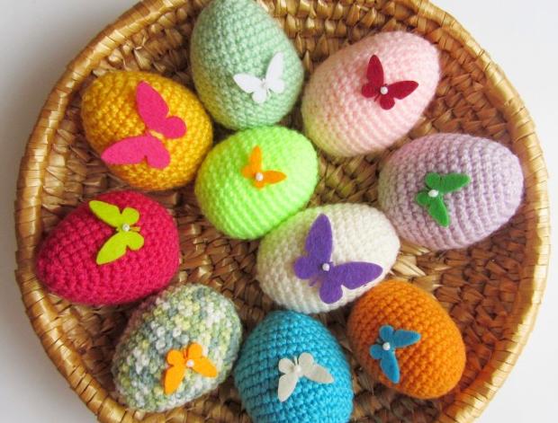 Dekorace na Velikonoce.Háčkovaná vajíčka o velikosti cca 6 cm,zdobené motýlkem z filcu.Vajíčka jsou háčkovaná z akrylové příze,plněná PES kuličkami.