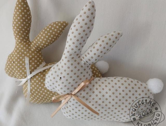 Zajíček Ušáček ušitý ze 100 % bavlněné látky béžové a bílé se vzorem drobných puntíků v opačné barvě, plněný dutým vláknem, zdobený stužkou a malou bambulkou.