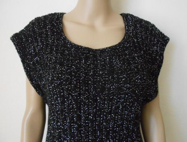 Dámská ručně pletená vesta, velikost 40-42 délka 68cm, šířka 44cm, . Vesta pletená z černé akrylové příze se stříbrným lurexem. Jde o velmi pružný vzor, který se přizpůsobí postavě. Doporučuji ruční praní a sušit volně položené.